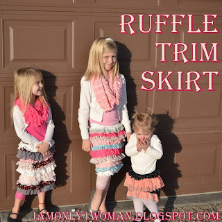 So this was the solution to my problem. I was able to use up some of my remnants and make the girls a cute new skirt. I also had some ruffle satin trim hanging around in my sewing room from Wholeport.