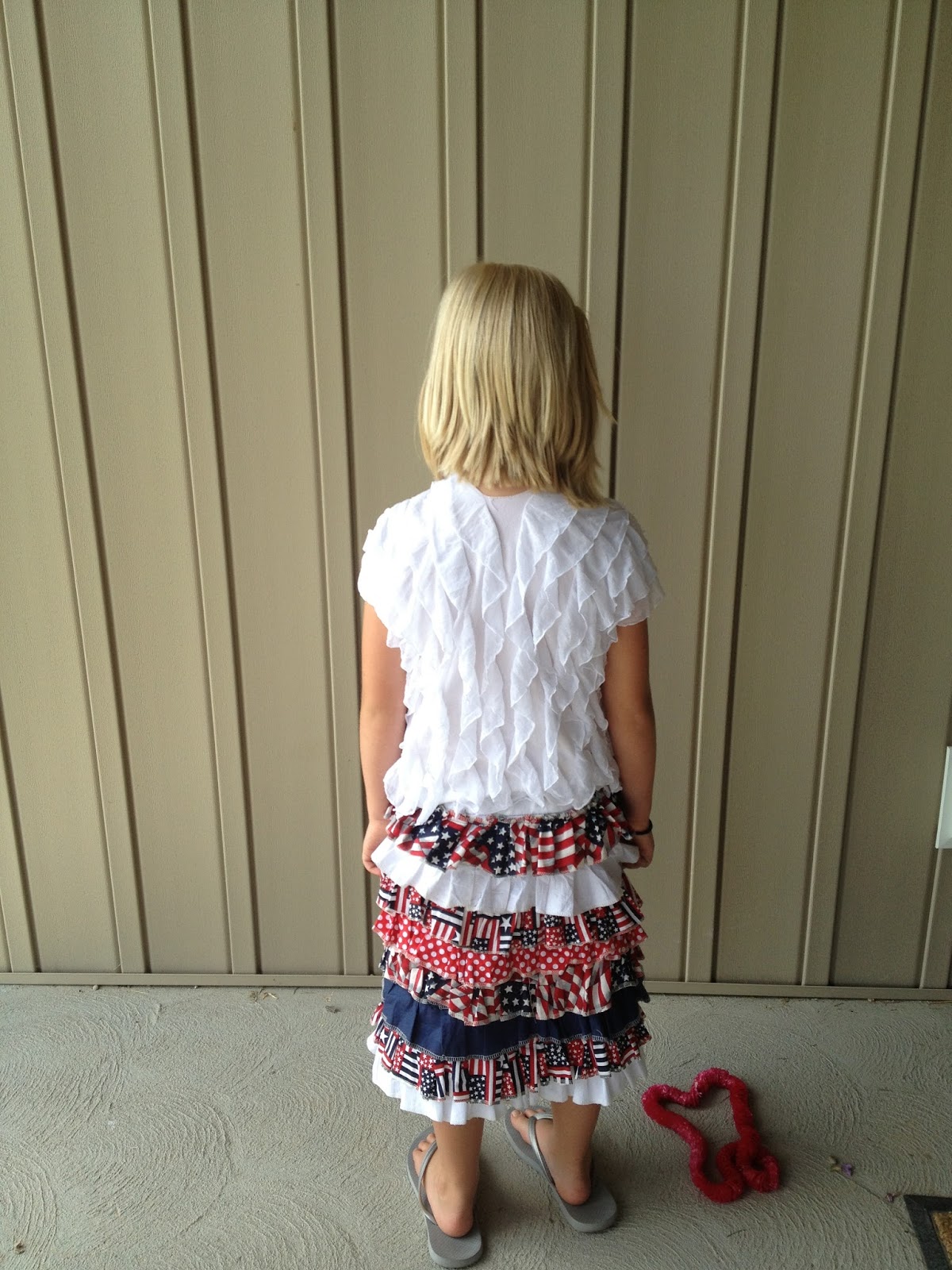 I did make a few changes though...I used fabric, so I needed to ruffle each piece of fabric. I also used my serger to serge the bottom edges of each ruffled fabric.