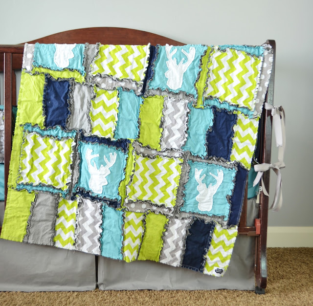 Next up, just might be my favorite. I haven't decided yet.It is our Mint, Navy Blue, and Gray Bear Crib Bedding and Rag Quilt